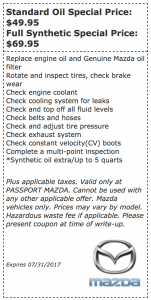 Plus applicable taxes. Valid only at PASSPORT MAZDA. Cannot be used with any other applicable offer. Mazda vehicles only. Prices may vary by model. Hazardous waste fee if applicable. Please present coupon at time of write-up.