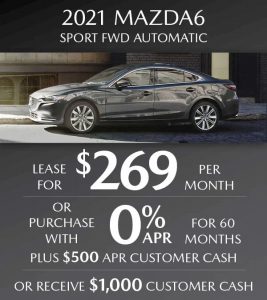 Lease a 2021 Mazda6 Sport FWD Automatic for only $269 per month or purchase with 0% APR for 60 months PLUS $500 APR Customer Cash or receive $1,000 Customer Cash. Click here to view our Mazda6 inventory.