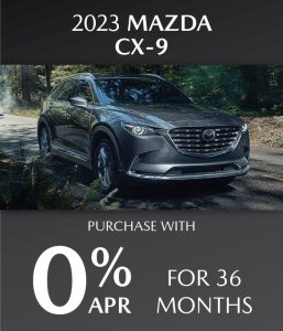 0% Annual Percentage Rate (APR) available on approved credit only for very well qualified customers when financing a new 2023 Mazda CX-9 through Mazda Financial Services at participating Mazda Dealers. Not all customers will qualify for credit approval or advertised APR. Amount of down payment and other factors may affect qualification.? Dealer contribution may vary and could affect purchase price and amount to be financed. 36 months at $27.78 per month per $1000 financed with $0 down at participating Mazda Dealers.?Tax, title, license, other options, loan origination fees and dealer fees may apply. APR offer only available for dealers in AK, AL, AR, AS, AZ, CA, CO, CT, DC, DE, FL, GA, GU, HI, IA, ID, IL, IN, KS, KY, LA, MA, MD, ME, MI, MN, MO, MP, MS, MT, NC, ND, NE, NH, NJ, NM, NV, NY, OH, OK, OR, PA, PR, RI, SC, SD, TN, TX, UM, UT, VA, VI, VT, WA, WI, WV, WY regardless of buyer’s residency. Void where prohibited. This offer is only available on participating Mazda Dealer’s current inventory, which is subject to availability. Offer ends 5/31/2023 and you must take delivery prior to expiration of offer. See participating Mazda Dealer for complete details.