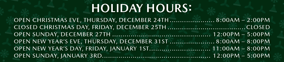 Open New Year’s Eve, Thursday, December 31ST….8:00AM-8:00PM