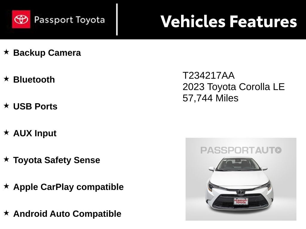 With a recent oil change, a detailed interior, and a clean bill of health from our rigorous dealer inspection, this 2023 Toyota Corolla LE is ready to become your trusted companion on the road. Experience the exceptional value and quality that Toyota is renowned for, and let this Corolla be the perfect addition to your lifestyle.