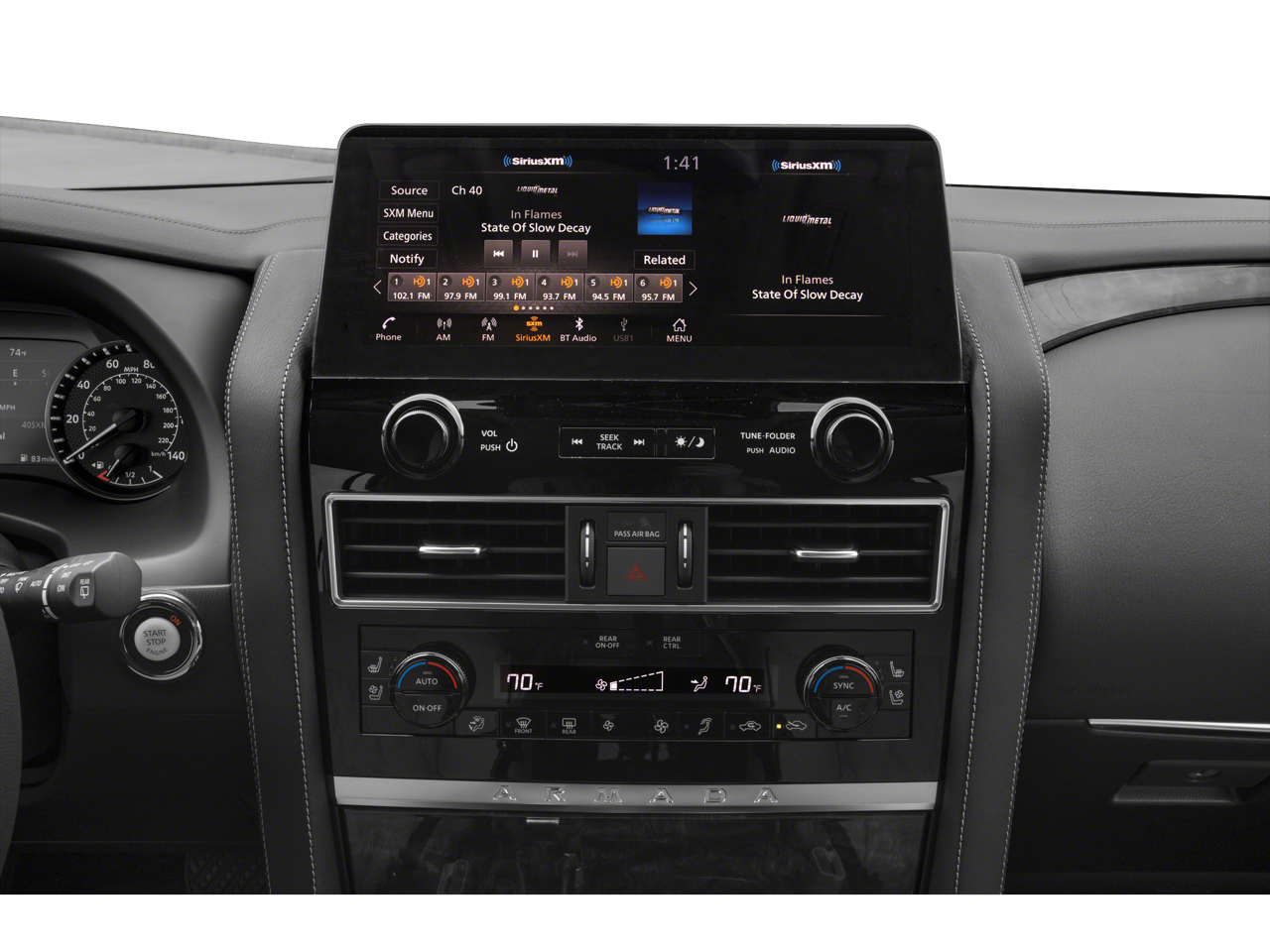 - Radio: NissanConnect w/SiriusXM -inc: 13 speaker Bose audio system, 2 subwoofers, Alexa built-in, wireless Apple CarPlay, Android Auto, Nissan door to door navigation, 12.3" color display w/multi-touch control, SiriusXM Traffic and Travel Link w/3 month complimentary trial access, NissanConnect Services powered by SiriusXM, Bluetooth® hands-free phone system, hands-free text messaging assistant, enhanced voice recognition, USB port for compatible devices, HD Radio technology and Wi-Fi hotspot