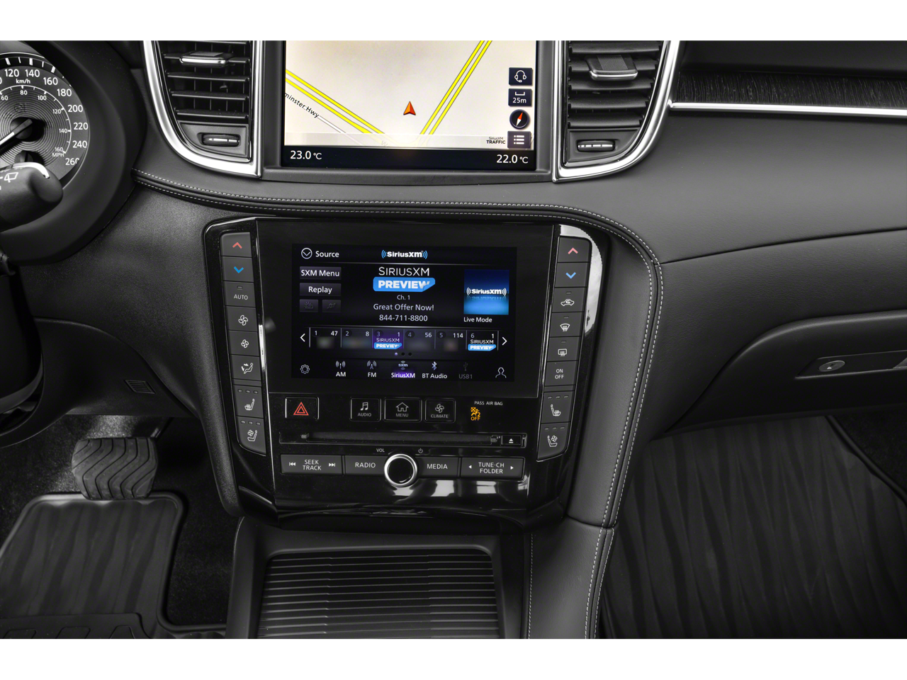 - Radio: Bose Performance Series Premium Audio -inc: 16 speakers, metallic speaker grilles on tweeters, INFINITI InTouch w/navigation and dual display system w/upper 8" and lower 7" touch screens, wireless Apple CarPlay, Android Auto, HD Radio technology, SiriusXM radio w/advanced audio features and 90-day complimentary trial, SiriusXM Traffic w/3-month complimentary trial, SiriusXM Travel Link w/3 months complimentary trial, INFINITI voice recognition, INFINITI InTouch services, Siri eyes free and Wi-Fi hotspot